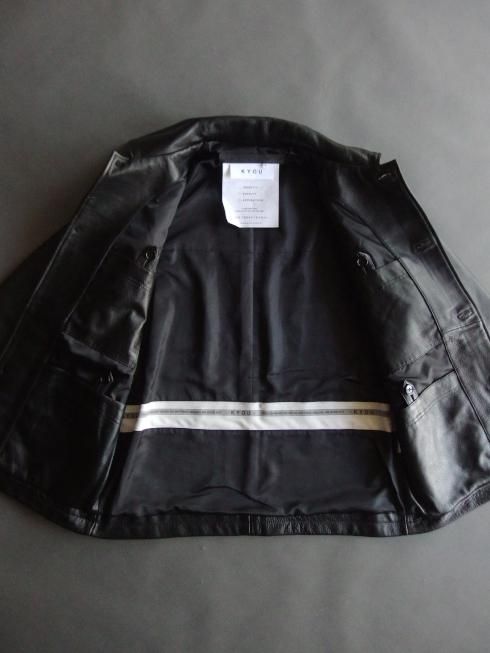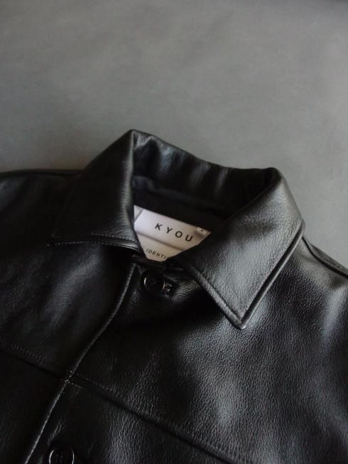 <商品説明> KYOU 2025A/W クラシックなスタイルのカーコートをベースに製作されたレザージャケット。 ブラウンスキンのカウレザーに顔料塗料で仕上げたレザーを使用することで経年変化が出やすい仕様になっています。 アタリやスレが通常のレザーより出やすく、着用を重ねていくことでベースのブラウンスキンが覗いて独特の色合いに変化します。 無駄を削いだタイムレスなデザインながらもライニングには大口のポケットを4つ配置し、裏地背面にはマーベルトを切り替えに配しており、見えない箇所でデザインにアクセントを付けています。 シンプルなルックスと厚手のトップスも無理なく着込むことができるゆとりのあるボックスシルエットで非常に着回しの効くレザージャケットになっています。 【素材】 ・表地 カウレザー ・裏地 キュプラ100