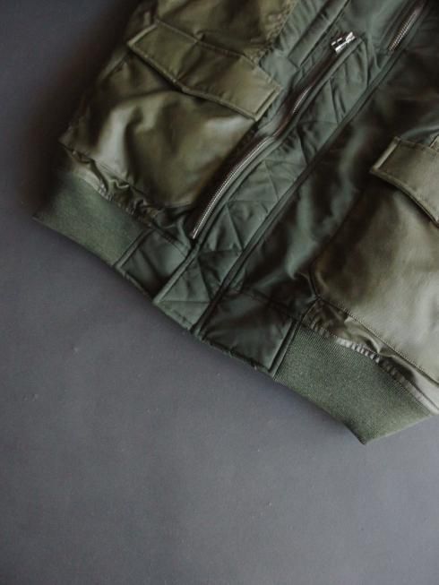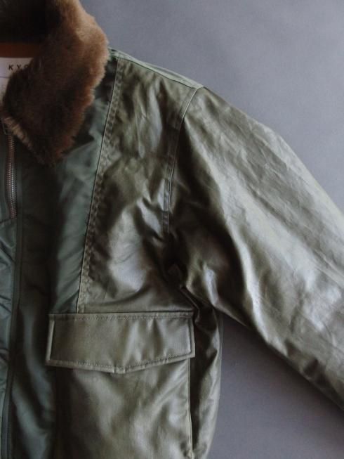 <商品説明> KYOU 2025A/W KYOUが提案するハイブリッドなミリタリージャケット。 B-10ジャケットを表裏ひっくり返した仕様をデザインベースにMA-1ナイロンとオイルドクロスをコンビネーションで組み合わせられています。 特徴的なオイルドは裁断パーツの状態でオイルド加工を施し、袖のシームやリブの境目は少し弱くなるようにグラデーションで緩急がつけられています。 オイルド加工は触感はオイリーでありながらも手に残ることはなく、独特の艶感のある特殊開発された薬品が使用されており、着込んでいくとレザーライクなエイジングが楽しめます。 このレベルのオイルド加工技術を持つ職人は非常に少なく、一人の職人が一点一点手作業で加工を施しています。 MA-1ナイロンはヴィンテージをリプロダクトしたもので高密度に織り上げたナイロンツイルの表面に撥水加工が施された生地で66ナイロンというミルスペックでも使用されている強度のある原料が使用されています。 撥水機能に加え、中綿入りで保温性も高く、軽量性も備えていますので、天候を気にせず気兼ねなくタフにお使いいただくことができる一着です。 襟のファーは脱着が可能な2WAY仕様。 【素材】 ・表地 ナイロン100 ・切り替え部分(オイルド) コットン100 ・裏地 ポリエステル100 ・中綿 ポリエステル100 ・ファー アクリル100