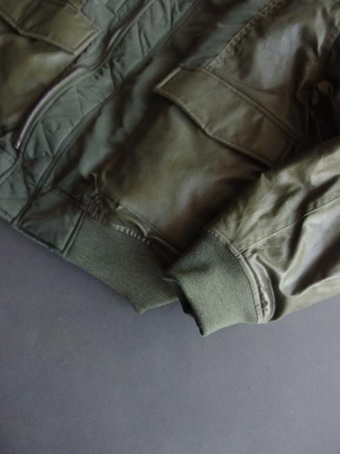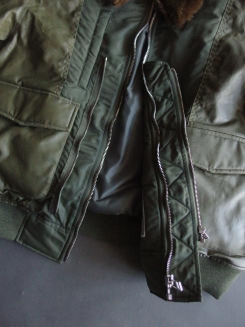 B-10ジャケットを表裏ひっくり返した仕様をデザインベースにMA-1ナイロンとオイルドクロスをコンビネーションで組み合わせられています。