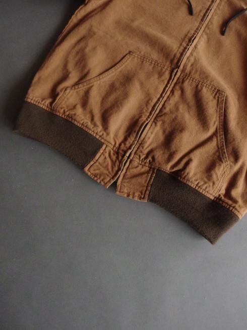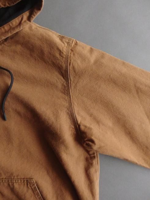 semoh 2025A/W ベーシックなワークウェア型のフードブルゾンです。 タフでありながらも綺麗めのダック生地を採用することで着用の幅を持たせています。 そのベースを軸に製品段階でバイオウォッシュ加工を施すことで最初から着古したような経年感が表現されています。 3本針のステッチワークなど要所にタフさの基礎を落とし込み、裏地も綿起毛を採用することでアウターとしても真冬のインナーとしても使えるワークウェアらしい高い実用性を備えています。 ストレートにデニムやワークパンツとのスタイリングはもちろんですが、スラックスなど綺麗なスタイリングに取り入れてお楽しみください。 【素材】 ・表地 コットン100 ・裏地 コットン100