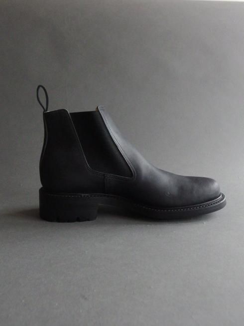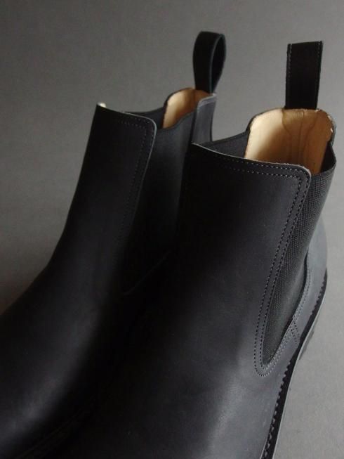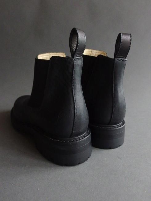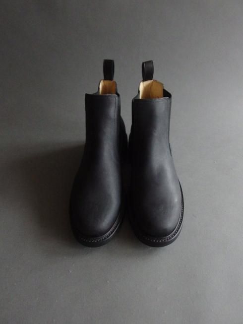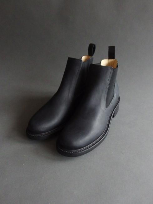 <商品説明> Post Production 「雨の日も気兼ねなく履ける靴」として製作されたブーツ。 粗野な表情のアッパーにタフなソールの組み合わせが悪天候の日にも心強い一足です。 ミリタリーのサイドゴアに見られるような後ろに傾倒したシャフトにより、履き始めるとすぐにシワが寄ってよりラフな雰囲気になるのも特徴の一つ。 アッパーにはイタリア製のホースバットを使用。コードバン層を含むお尻の革で吟面は粗く仕上げられており、新品時は掠れた色味が特徴的な黒色ですが着用を重ね、オイルを塗っていくことで鈍い艶のある黒色へと変化していきます。 1枚の中でも箇所ごとに質感の異なる革の為、1足1足、左右でも個体差があるのも魅力の一つです。 硬質な表情ながらもしなやかさがあるのは馬革ならでは。オイルをたっぷり含んだバケッタ製法により履き馴染みも非常に良く、1週間も履けば良いシワが入ってどんどん自分だけの表情に変化していきます。 たっぷりとオイルを含んだ革とストームウェルトによる自然な防水性があり、日々の生活の中での着用において十分な機能性も備わっています。 製法にはグッドイヤーウェルト製法が採用されており、履き込んでいくことでインソールが沈み込み足にぴったりと馴染んできます。 履き込んだグッドイヤー靴ならではの極上の履き心地とアッパーの表情の変化をお楽しみいただけますので、ぜひ日々の生活に取り入れて長くご愛用いただきたい一足となっています。 ※こちらの製品は本革製品です。その為、個体差がございますので写真のものとは風合いが異なる場合がございます。予めご了承の上、ご注文くださいますようお願い申し上げます。 ※サイズが合わない、間違えて注文した、イメージと違うなどお客様都合での返品はお受けいたしかねます。 サイズ、カラーの交換は在庫がある場合のみご対応いたします。またその際の往復の送料はお客様ご負担にてお願いいたします。 その他ご不明点、ご不安な点がございましたら下記よりお問い合わせください。 info@raze.jp 【素材】 ・アッパー Rough Horse Butt ・ソール Leather+Ridgeway ヒール高 4.5cm made in Japan