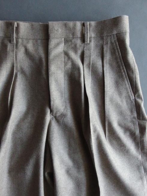 <商品説明> Nikki ESSENTIAL PIECES 2025A/W 2本のタックが入ったテーパードシルエットのトラウザーです。 生地には経糸にウール、緯糸にカシミヤ混の太い糸を高密度に打ち込むことで適度なハリとコシがありながらもカシミヤのウォーム感と光沢を感じるシャープなフラノ素材を採用。 素材のドレープ性が柔らかいワイドシルエットと相性が良く、ニットやアウターなどとの冬のスタイリングにリラックス感のあるドレスな表情を与えてくれます。 強い起毛感のある素材ではない為、春先まで長い期間お使いいただける一本です。 【素材】 ウール89 ナイロン8 カシミヤ3